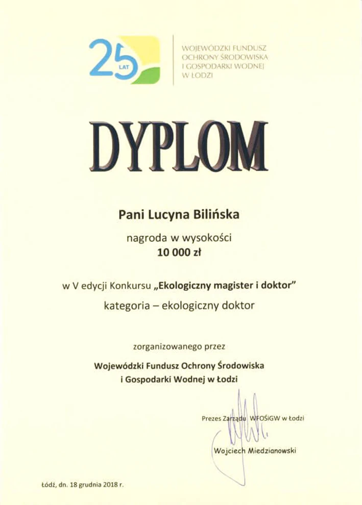 Miło nam poinformować o zdobytej nagrodzie przez dr inż. Lucynę Bilińską w V edycji Konkursu „Ekologiczny magister i doktor”.
