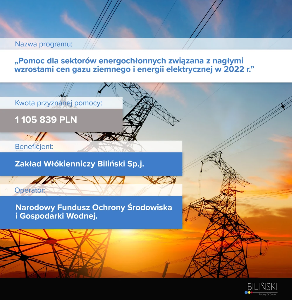 Zakład Włókienniczy Biliński Sp. J z siedzibą w Konstantynowie Łódzkim informuje, że otrzymał dofinansowanie w ramach rządowego programu „Pomoc dla sektorów energochłonnych związana z nagłymi wzrostami cen gazu ziemnego i energii elektrycznej w 2022 r.”