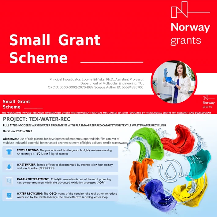 Dr Inż. Lucyna Bilińska – prowadząca badania w Katedrze Inżynierii Molekularnej PŁ oraz Kierownik działu B+R w Zakładzie Włókienniczym Biliński, została laureatką konkursu „Small Grant Scheme”. Jej projekt pt. „Nowoczesne techniki oczyszczania i recyklingu ścieków włókienniczych z wykorzystaniem katalizatorów plazmowych” znalazł się na liście 27 wniosków zarekomendowanych do dofinansowania. Na realizację nagrodzonych projektów przeznaczono sumę aż 5 mln euro.