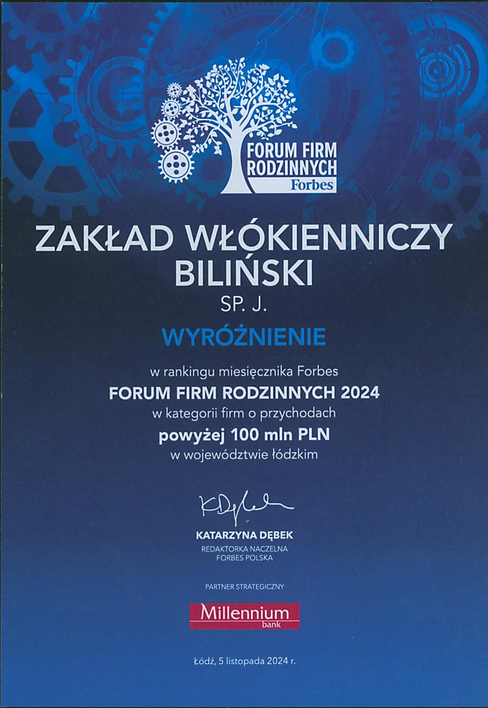 Mamy zaszczyt poinformować, że nasza firma została wyróżniona w prestiżowym rankingu „Forum Firm Rodzinnych 2024” przygotowanym przez miesięcznik Forbes we współpracy z Dun & Bradstreet Poland, w kategorii firm rodzinnych o przychodach poniżej 100 mln złotych w województwie łódzkim.